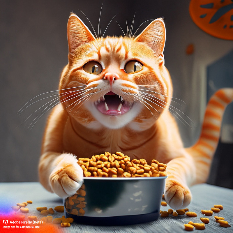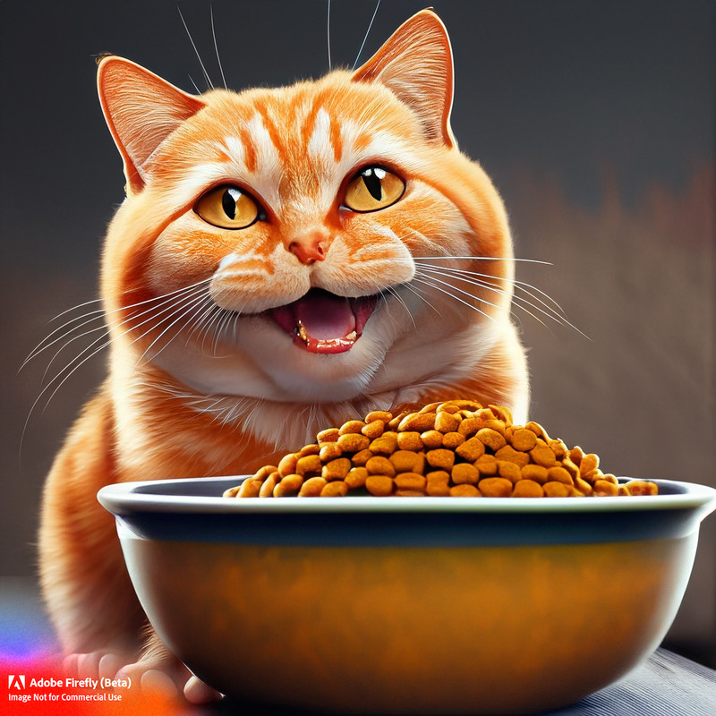 Nog een idee : orange cat that eats a lot of cat food and feels satisfied after eating the food