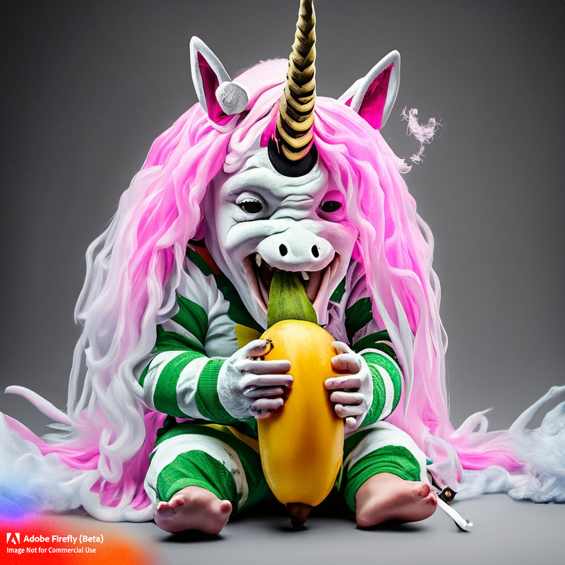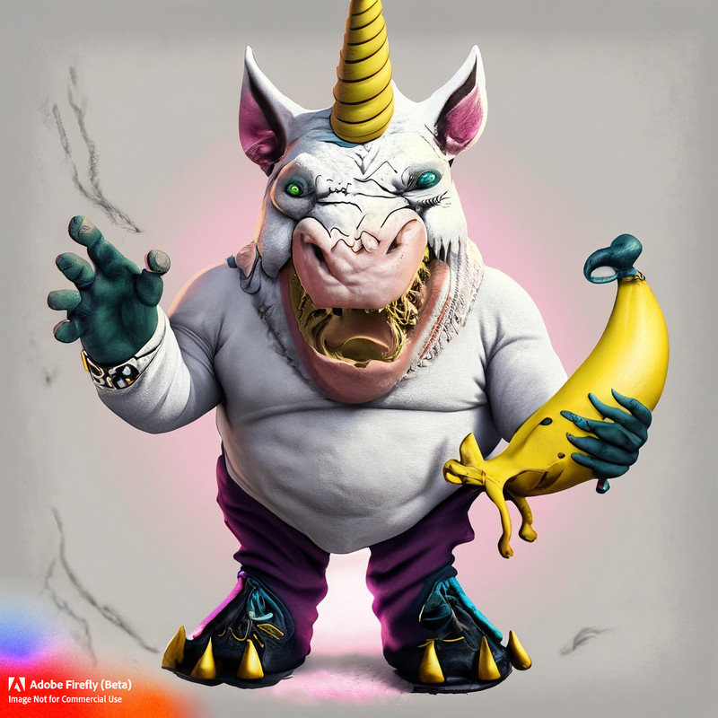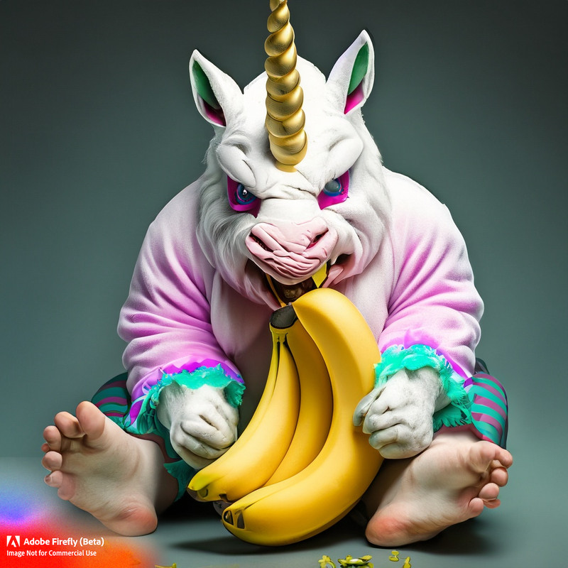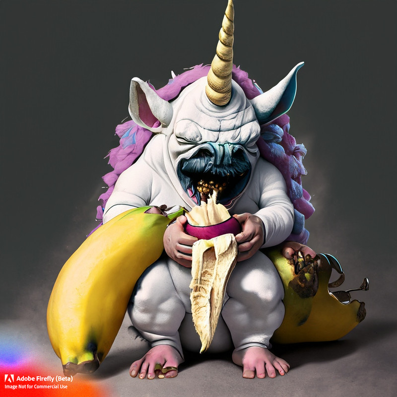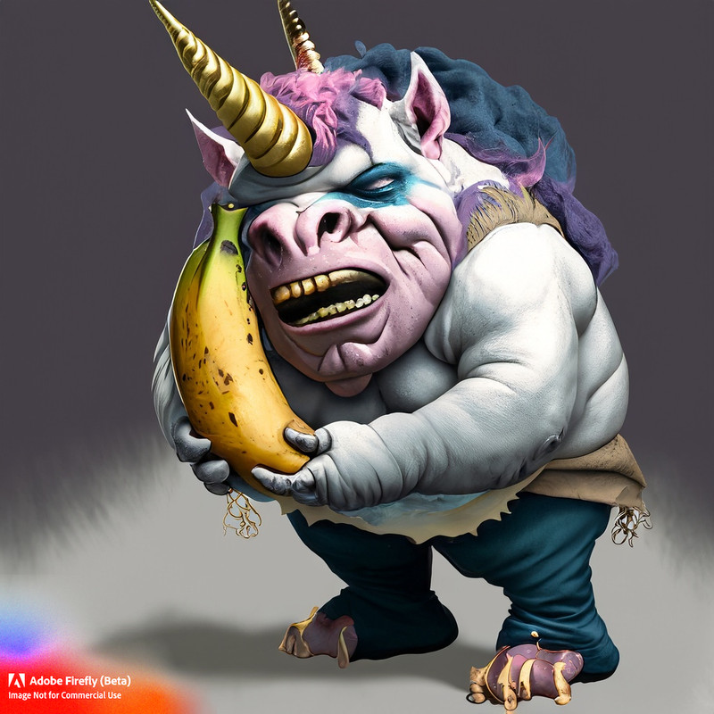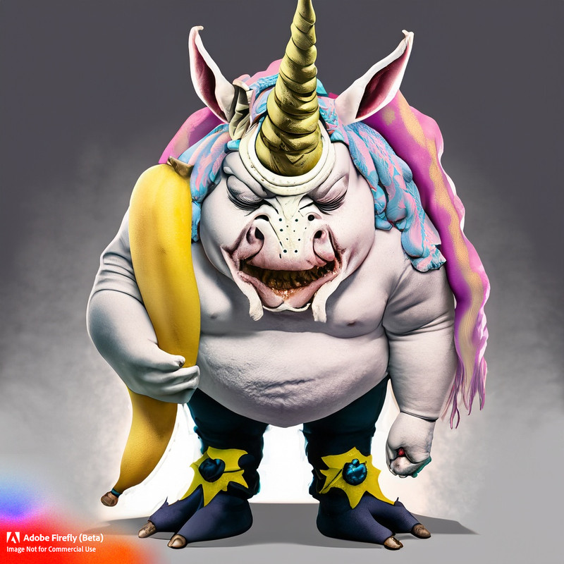 An oger wearing an unicorn costume with a banana in his mouth, he also has black feet. In realistic style.