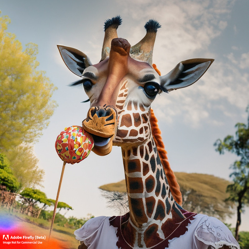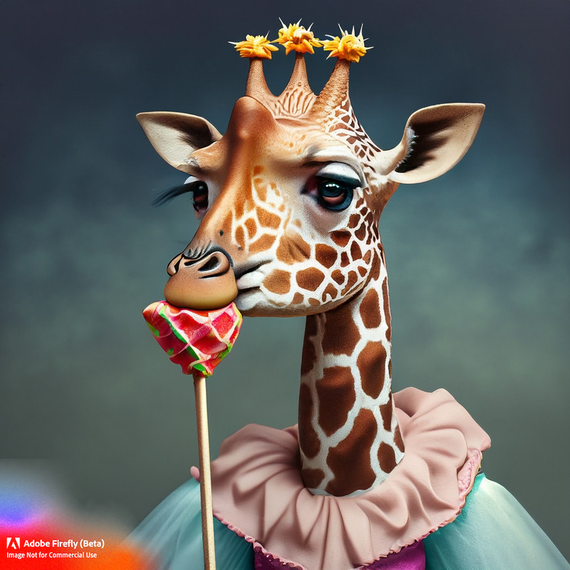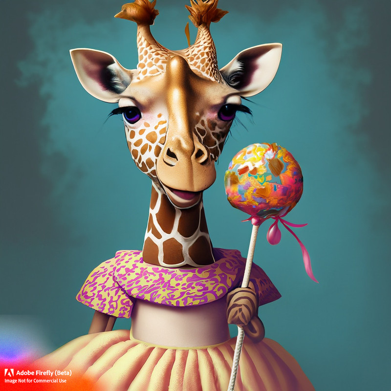 a giraffe eating a lolly wearing a princess dress
