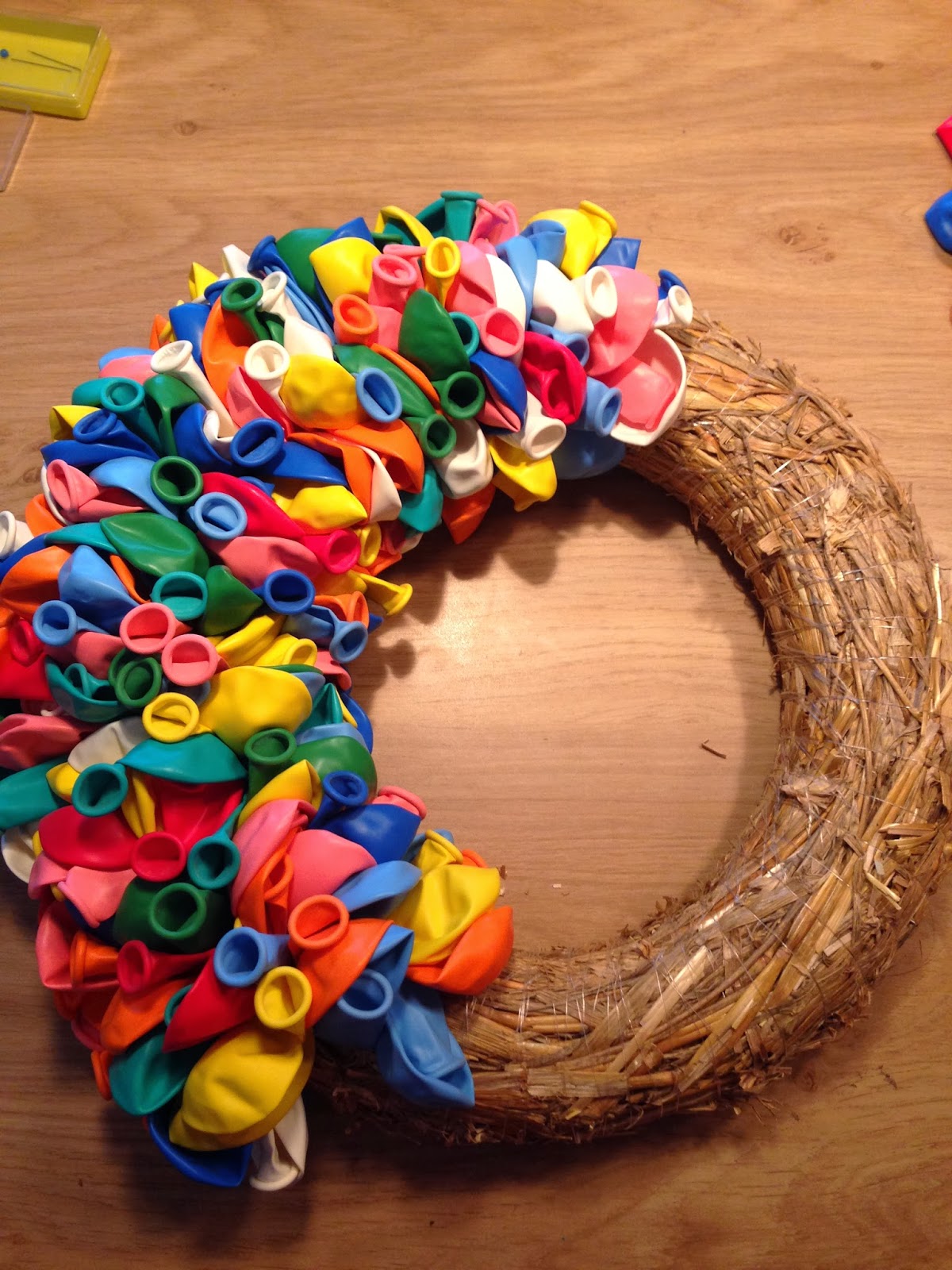 Ik heb een keer een stro krans gemaakt met waterballonnen. Heb toen kopspelden gebruikt,. is heel simpel, wel veel werk.