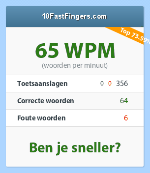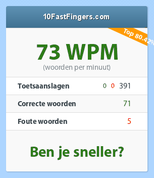 Gydo schreef: Resultaat Screenshot[table]Woorden per minuut (WPM)91Toetsaanslagen462 (455 | 7)Correcte woorden90Onjuiste woorden2You are better than 91.52% of all users (position 104 of 1226 - last 24 hours)[/table]