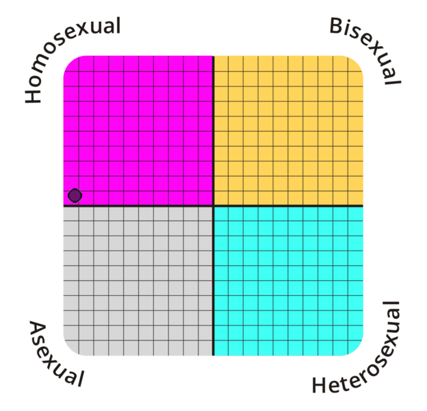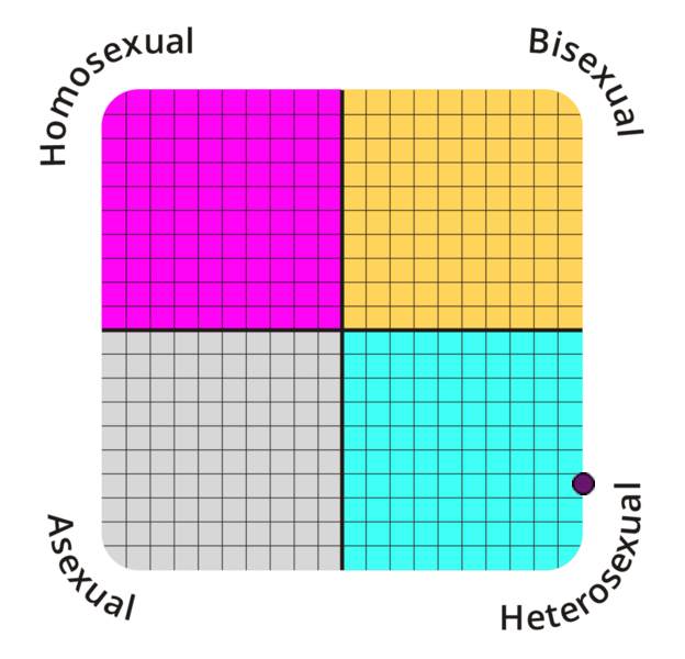 Your sexual orientation is 89.3% heterosexual, 71.4% homosexual, which places you in the bisexual quadrant.