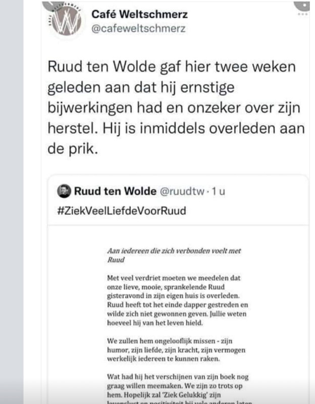 Op Twitter vertelde Ten Wolde openlijk over zijn ziekte. In mei vorig jaar werd hij schoon verklaard, maar recentelijk keerde de kanker terug. Begin oktober kreeg hij zwaardere medicatie en vertelde hij dat hij niets anders kon dan liggen.
